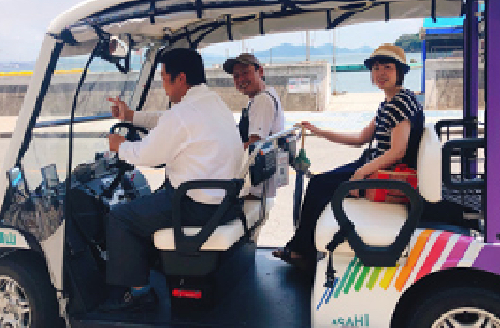 世界文化遺産に登録された黒島で運行開始。長崎県初のヤマハ製電動カートを実装導入し、観光客の皆様の無料送迎やレンタカーとして活用。