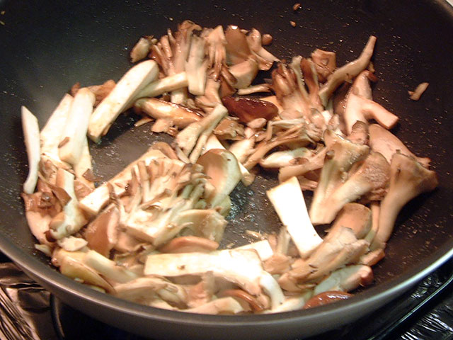 カツオを焼いたフライパンに油を引かずそのままきのこ類を入れてしんなりするまで炒める。