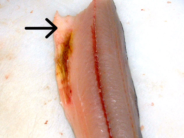 腹の下から包丁を入れ骨に沿ってだんだん深く切っていく。次に背に包丁を入れ、全体に浅く切れ目を入れた後、骨に沿って深く切っていき、最後に腹からの切れ目と背からの切れ目を合わせて尾に向かって切り落とす。