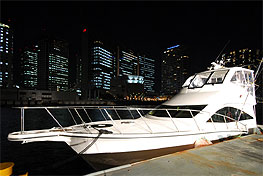 パーティ形式で行われた「EXULT」の発表会には、メディア関係者を中心とした約80名が集まりました。開会に先立ち、ヤマハ発動機(株)国内マリン事業部の笹川部長より「EXULT」シリーズの展開案や「EXULT 45CONVERTIBLE」のコンセプトが紹介されました。その後、桟橋に係留された「EXULT 45 CONVERTIBLE」がライトアップされ登場。プレミアムボートの雰囲気を漂わせたシルエットがブルーのライトで浮き上がると大勢の来場者から拍手がわき起こりました。