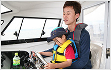 名古屋ボートショーで試乗会を知りこの試乗会にお越しになった西尾市在住の大西さんご一家のYF-24の試乗に同乗させていただいた。ボート免許は4年程前に取って、ボートを持っている先輩と一緒に釣りに出掛けたりはしていたのですが、試乗会というのは今回初めて参加させてもらいました。名古屋ボートショーには何回か行った事があるのですが、中々試乗会というのは参加する機会がなく、今回家族も連れてきたのですが、すごく楽しかったです。息子の晴人(はると)君(4歳)も全然怖がらなかったですし、いつかはマイボートをという夢が膨らみますね・・