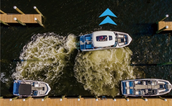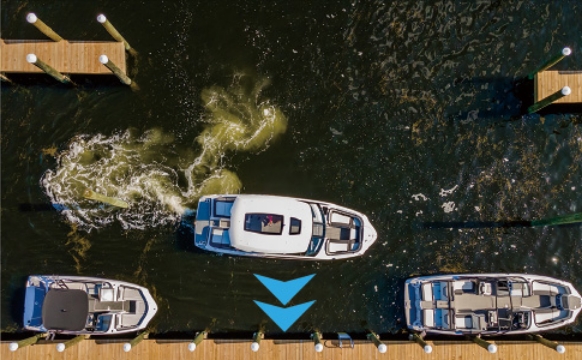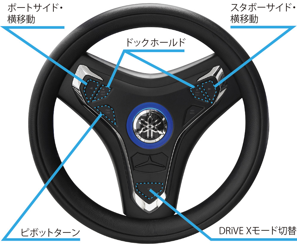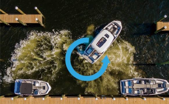 左右への横移動だけでなく、「ピボットターン」は、その場回頭ができ、「ドックホールド」は桟橋側に推進力を掛けることでボートが桟橋から離れなくなり、乗下船や係留作業に便利です。