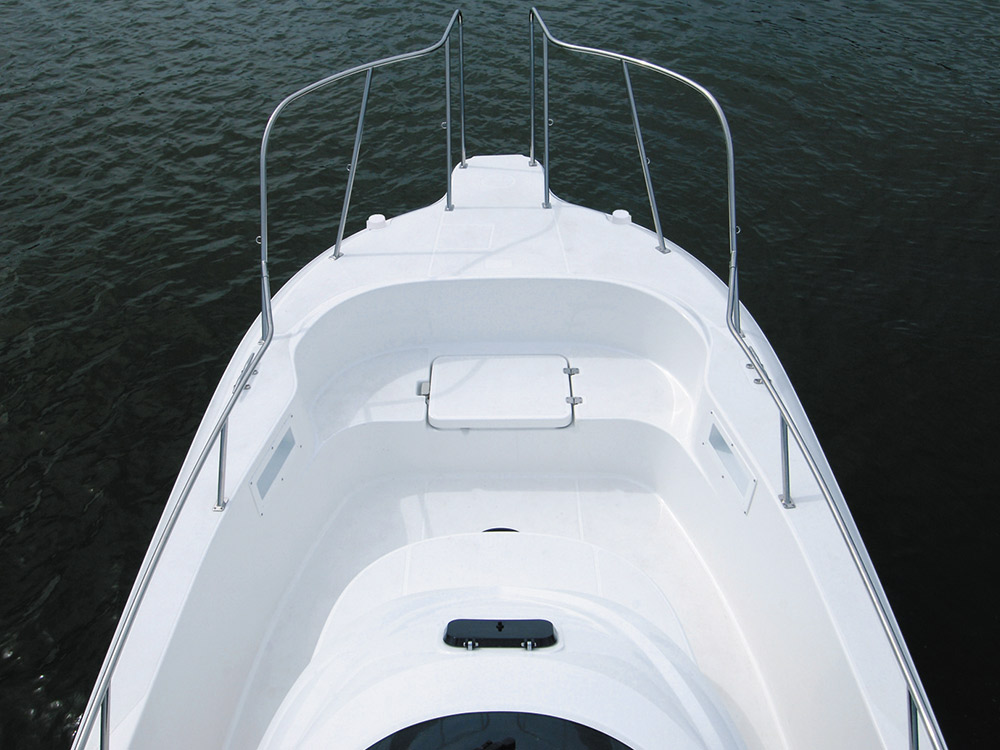 広くフラットなバウデッキは十分な釣りスペースを確保。高く設定されたバウレールがアングラーをサポートします。