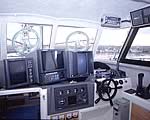操舵室。航海計器は左から魚探、GPS、レーダー。前方、側方とも視認性はよい