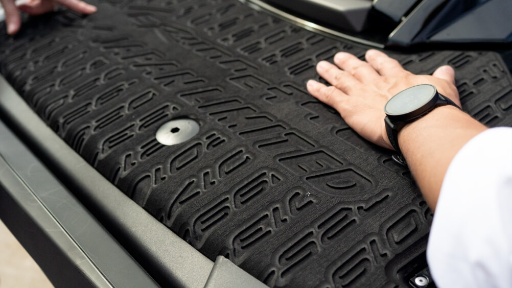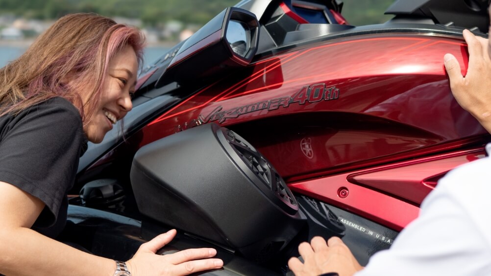 WAVERUNNER40thのロゴには、「FZR」の「R」や「Venture」の「Ve」など、過去に使用されたロゴデザインを組み合わせており、年代によって見覚えのある方も多いはずです。その他フロアマットパターンにはこれまでの年代を、ハッチのグラフィックには“40”をモチーフとした形状で展開するなど、随所に施したWAVERUNNERブランドの歴史を感じさせるディテールにもぜひ注目していただきたいです。