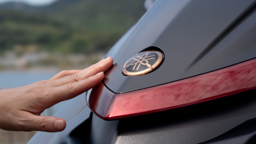 塗装色、エンブレム、ロゴに至るまで、すべてをワインレッドで統一しています。特に「YAMAHA」ロゴにこのカラーを使用するには、社内の厳格な規定をクリアする必要があり、採用されること自体が非常に希少です。そのため、このワインレッドは、特別な存在感と高い価値を備えたカラーとして、デザイン全体に深みと品格を与えています。