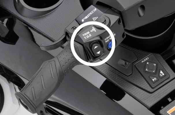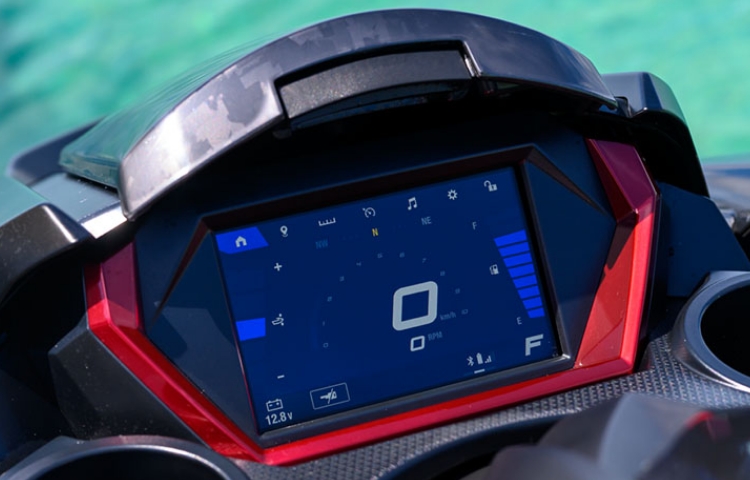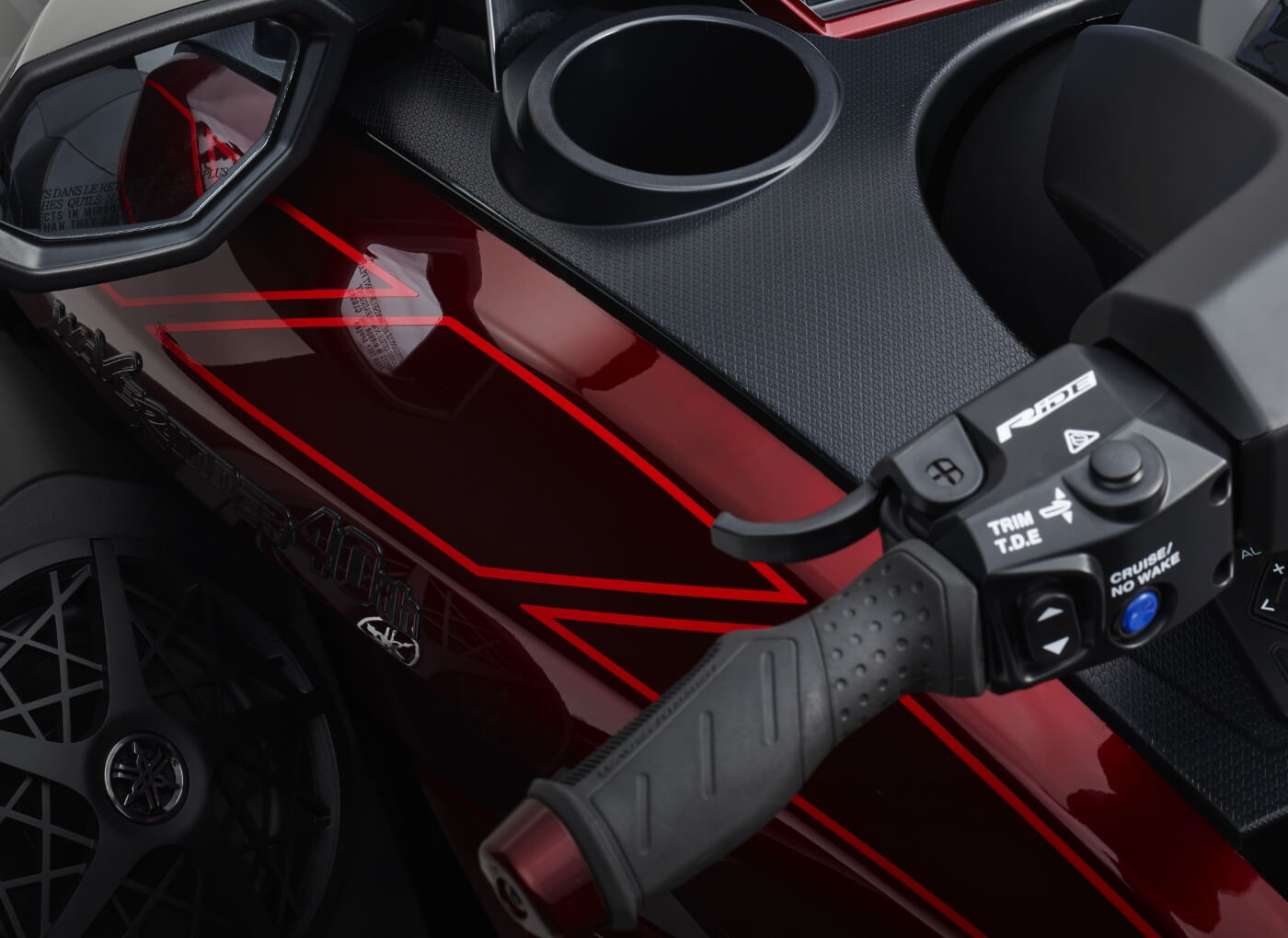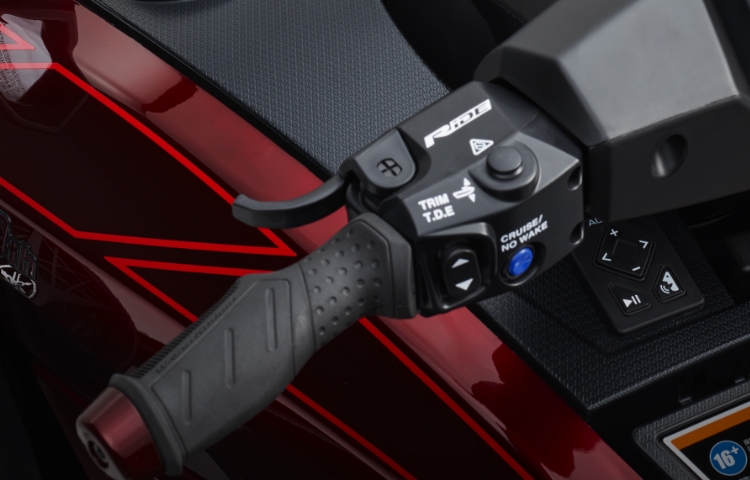 左グリップ側のボタン操作により、走行状態に応じた最適なトリムに設定できる電動トリムシステム。立ち上がりの素早いプレーニング状態の確保や、走行中の加減速によるバウの跳ね上がり・沈み込みの低減、波を乗り越える際のバウのコントロールなど、さまざまな速度域における艇体の姿勢保持に効果を発揮。ライダーの意図に合わせた走行を素早く、的確にサポートします。