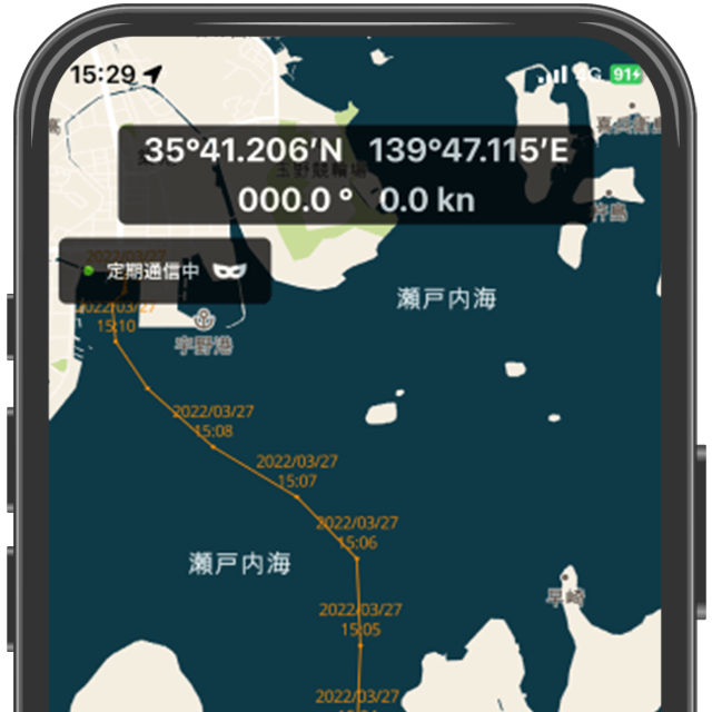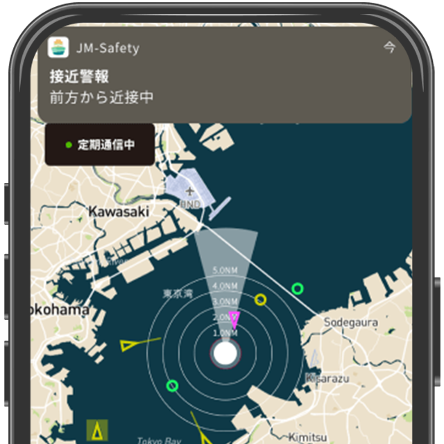 周囲の船舶の位置をアプリ上でリアルタイム表示し、船舶接近時や衝突の危険がある場合は通知します。濃霧や雨などの状況下でも把握・安全な航行をサポートします。