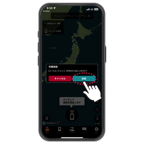 1.アプリを起動し、「タッチして通信を開始します」通信ボタンをタップします。