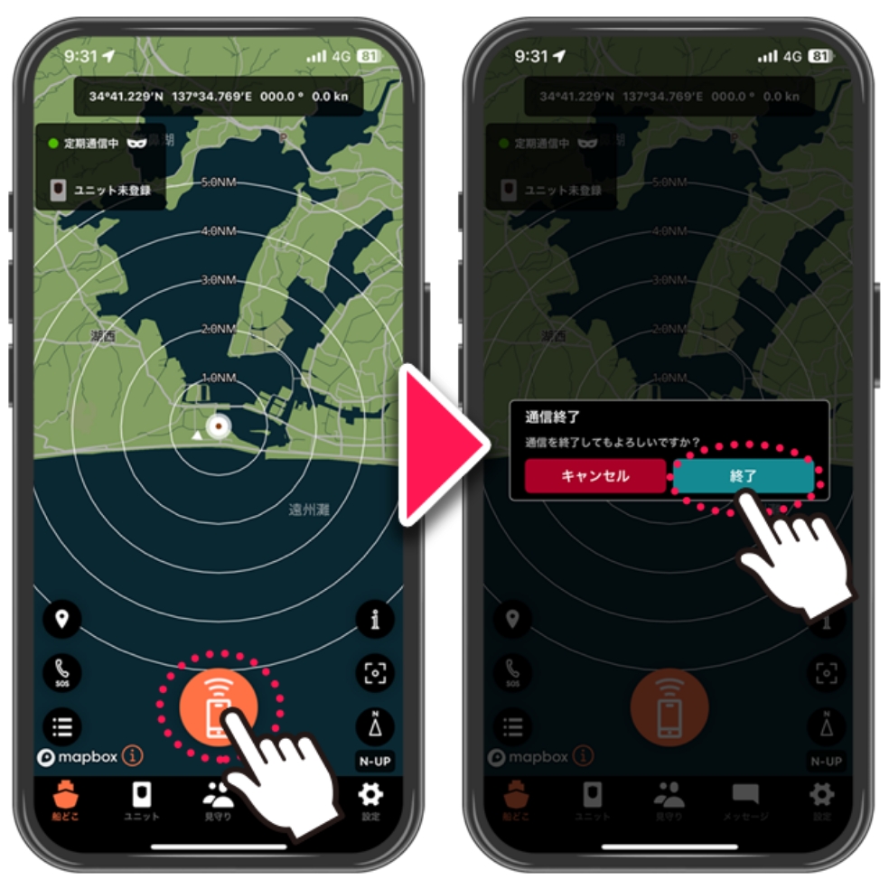 2.通信終了「終了」をタップ
