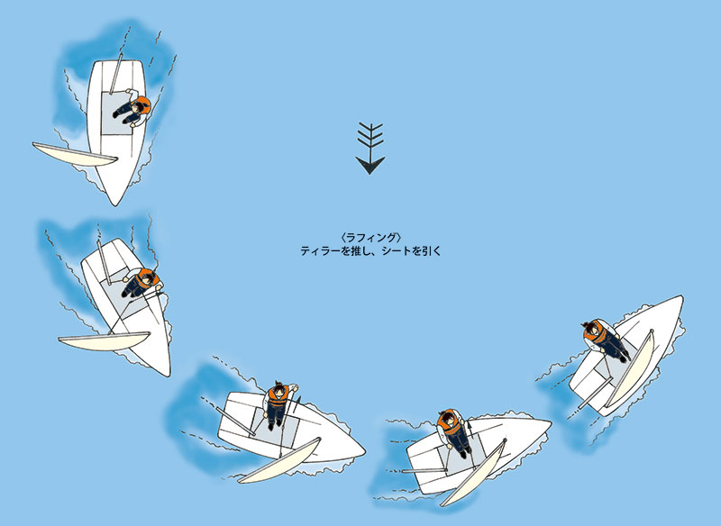 ランニングからクォーター、アビーム、リーチング、クローズホールドヘ風上へ方向をかえることを全てラフィングといいます。ティラーをわずかに押し、シートを引きます。ティラーを大きく押しすぎると、バウが回るスピードにセイルトリムが追いついてゆけず失速してしまうことがあります。また、シートを引きすぎてしまうことがよくあるので、ブームの位置などでシートの引くだいたいの量を覚えておきましょう。ラフィングしてゆくと、通常はそれまでの走りよりヒールが大きくなります。センターボードを適正なところまで降ろす、ハイクアウトなど体重移動を素早くおこないます。