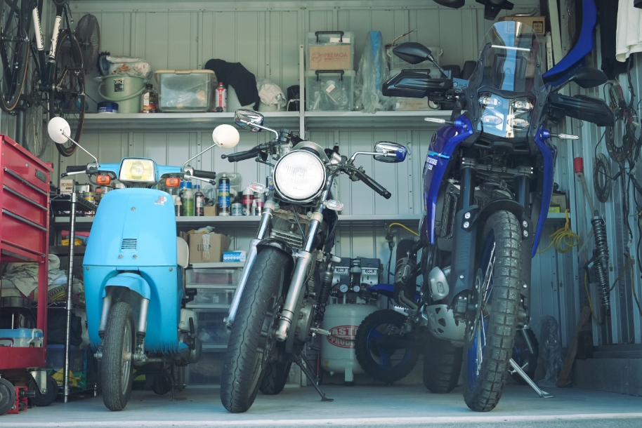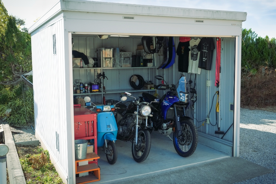 - ガレージで過ごす時間は「リラックスタイム」。バイクを眺めながら整備や趣味を楽しむ場所となっている。