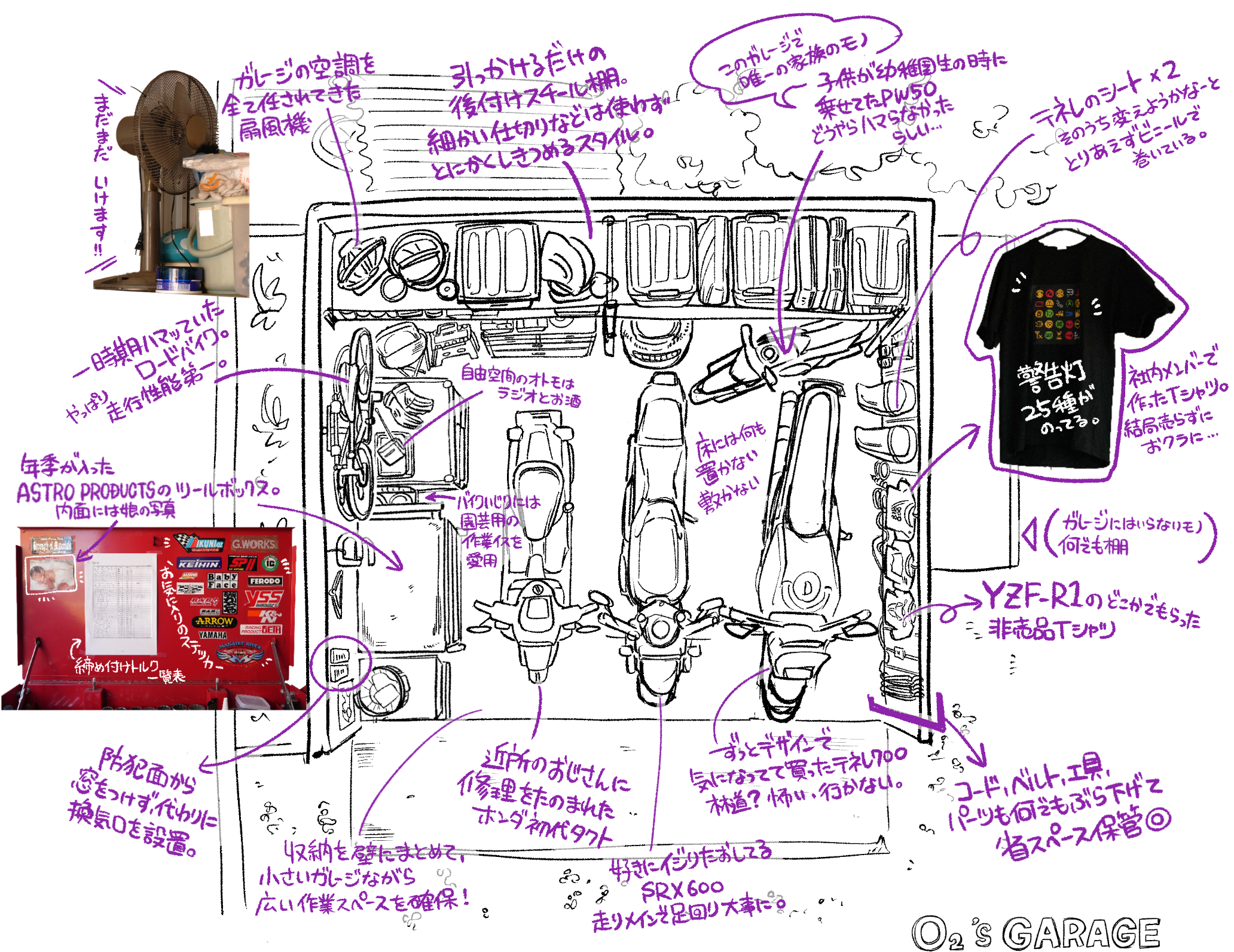 また、ガレージの建てる場所の決め方や、門限までに帰れるようにSRX-6に時計を付けているところ、工具ラックに貼られた家族の写真や壁に掛けられた思い出のTシャツにO2さんの人の良さが見えたインタビューでした。