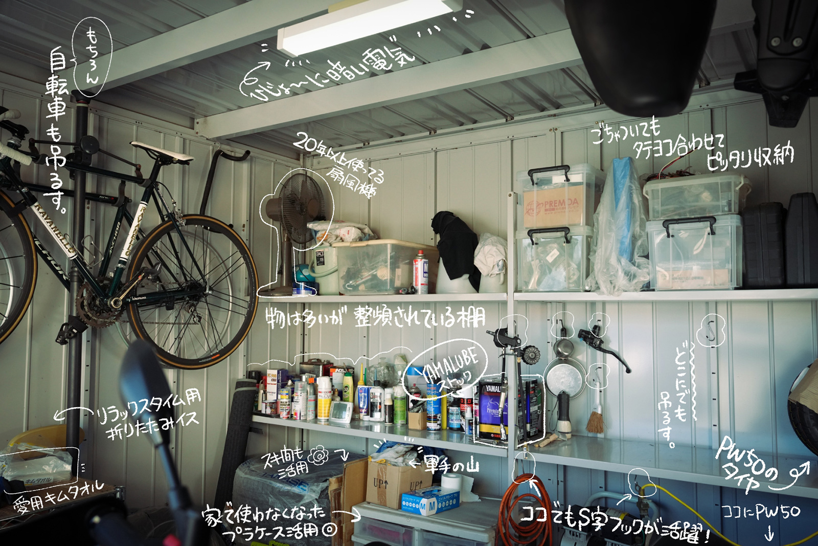 - ガレージ内は工具やケミカル類を機能的に整理し、限られたスペースを工夫して活用。