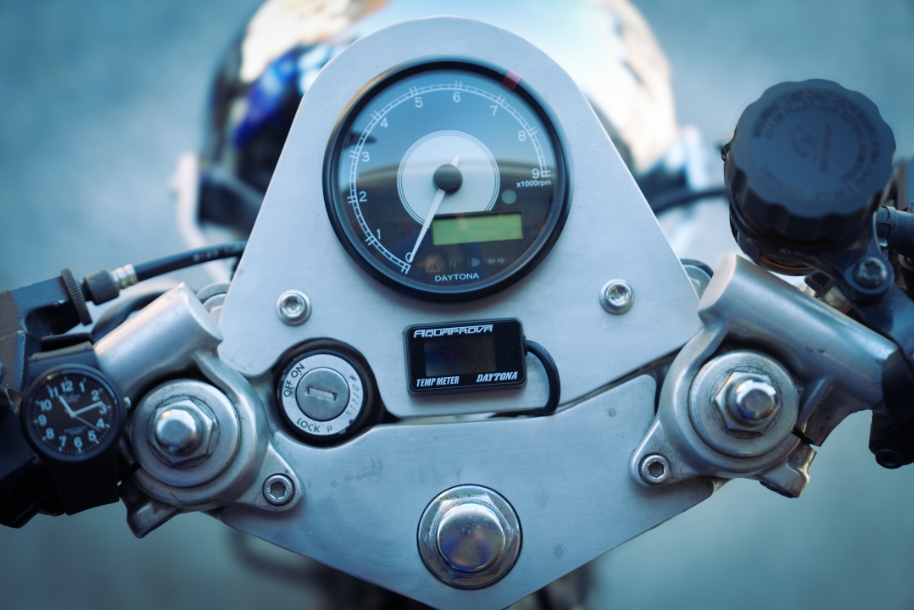 メーターもステーを自作して社外のメーター付けて、ハーネスを自分で引き直してます。昔の2ストレーサー時代のタコメーターしかない計器をイメージしましたが、車検に必要なスピードメータを含め保安部品は全て付いています。
