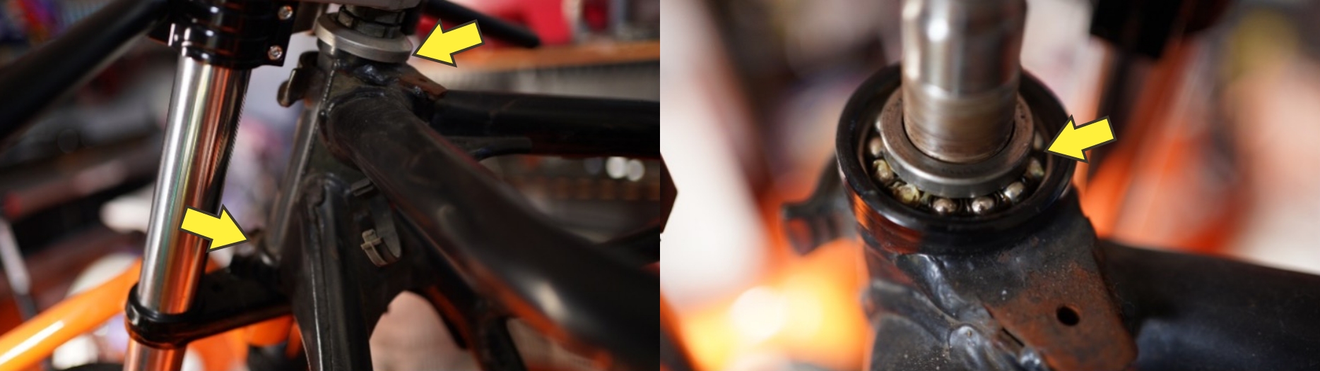 ステアリングヘッドベアリング。 フロントフォークとフレームを繋ぐ部分にある上下2対のベアリングです。よく見たら分かると思うのですが、車両とライダーの荷重を支えつつ、滑らかなハンドル操作を行う重要な部品で、ハンドリングの要ですね。
