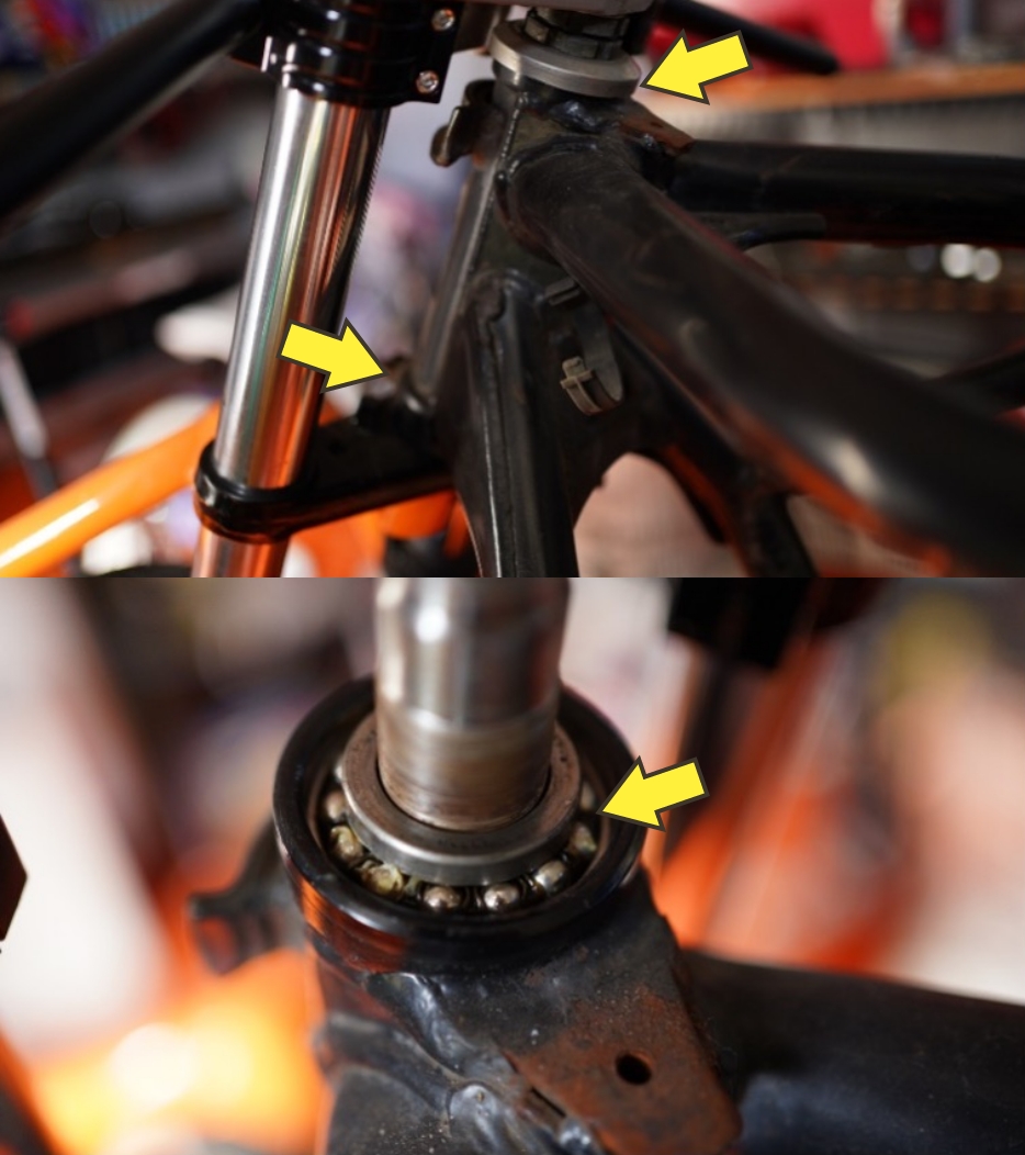 ところがある時、ハンドルをゆっくり切ると、真ん中あたりで 「コッ」 と引っかかる感触が出てきた。ハンドルを切った時のゴリゴリ感や違和感、これはベアリングの当たり面が傷んでるサインです。この小さな違和感に気づいてしまうと、もう気になってしょうがない。絶景のワインディングロードにツーリングに行ってもまったく楽しめません。例えるなら、靴の中に入った小石のような存在。バイクに乗っている間、やたらと「コクッ、コリッ」っと頼んでもないアピールを続けてきます。