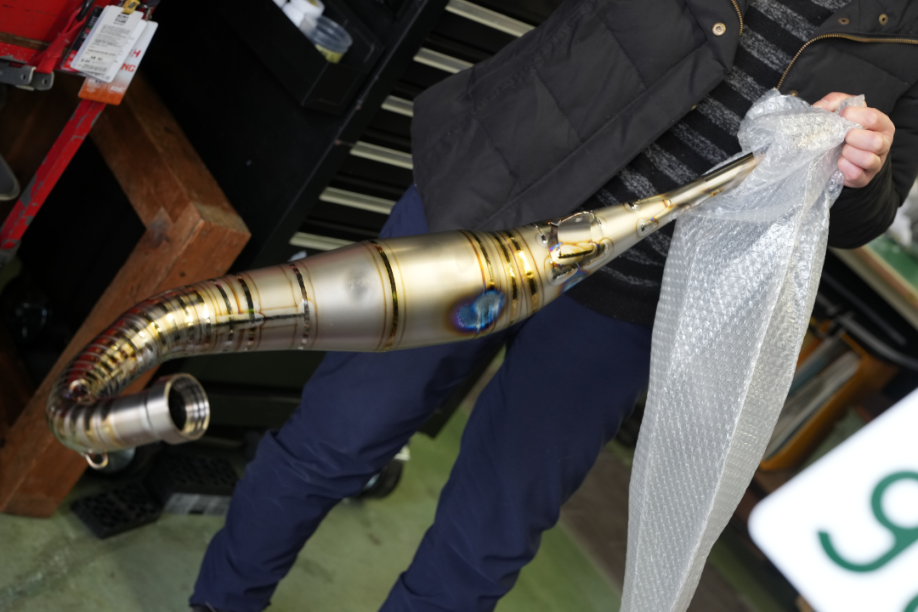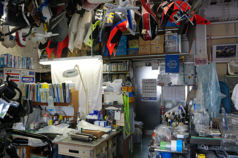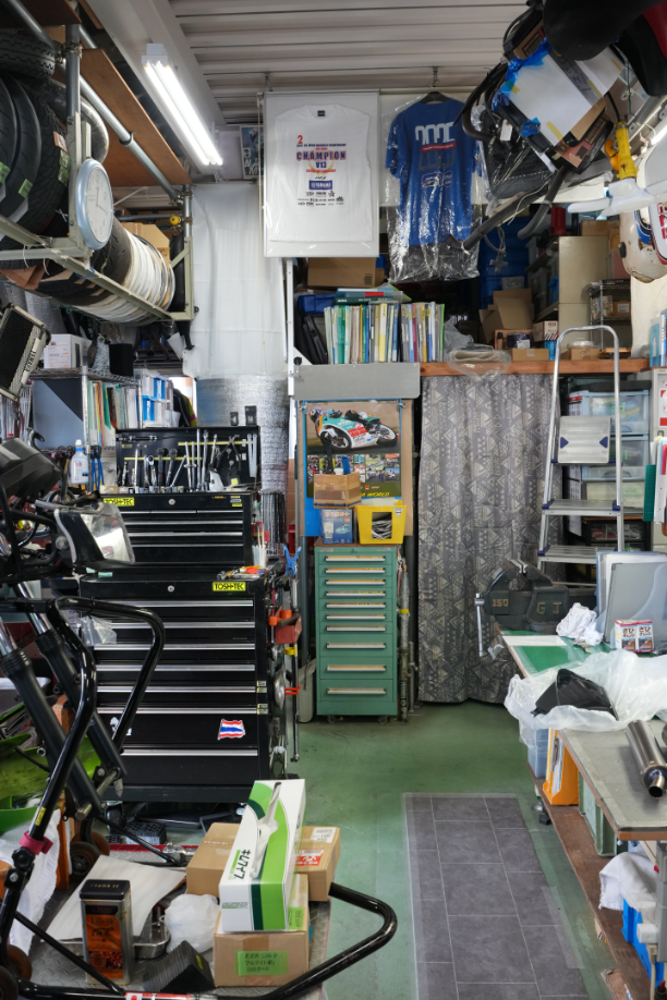 - 店内は多くの部品や工具がありながらも整理されており、2スト車の貴重なパーツやエキスパンションチャンバーが多数保管されている。