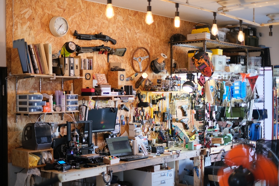 合板の壁を含めハンドメイドの作業エリア。