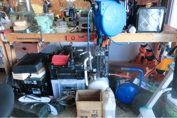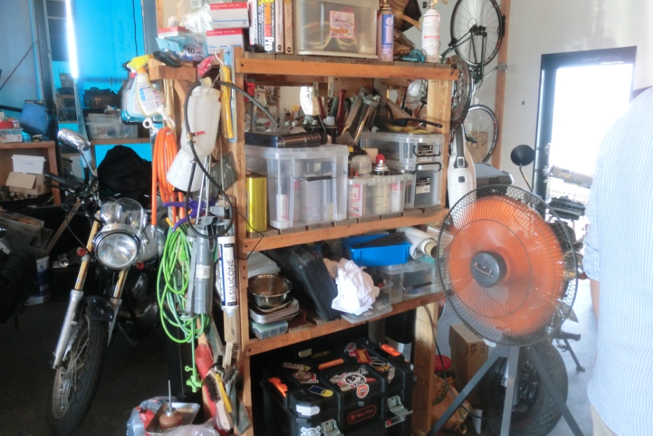 店舗跡のスペースのため空調完備で、住居と一体化しているためセキュリティも高く安心快適なガレージライフが過ごせます。インナーガレージの重要な点はガソリンやタイヤが放つ強烈な臭気をいかに抜くかという点です。天井付近と床付近両方に有圧換気扇を設置し、重いガスも軽いガスもきっちり排気できるようにしました。これをしないと家族からクレームを受けガレージライフは満足に立ちゆきません。工具・機械はコンプレッサー・ボール盤・3Dプリンター・溶接機・オシロスコープ等、二輪四輪の基礎的な整備に困らない程度には揃っています。