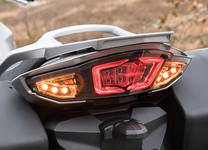 テールライト周りもデザインを変更しました。通常、テール周りにLEDを採用すると小型化する傾向にありますが、FJRは逆に、少し大型化しました。またテールレンズ外側のアウターレンスのほかに、二枚のインナーレンズを使い、光帯のカタチや配置、光らせ方にもこだわりました。FJRに追い抜かれたときの、去り際の印象は非常に重要です。そこでフラッシャーライトが点灯したときのFJRらしいダイナミック感を演出したかったこと。そしてヤマハ・ツーリングカテゴリーの最高峰モデルらしい後ろ姿を演出するために立体感のあるテールライトを目指したからです。