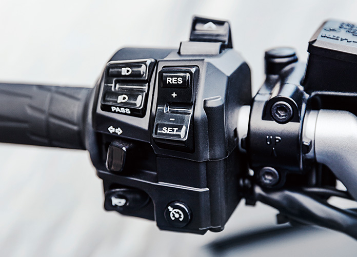コーナーリングライトは左右ふたつに分かれたヘッドライトの上側に、左右それぞれ三灯を配置。車速やバンク角などに応じて、三つのライトがヘッドライト照射範囲を補足します。あるバンク角を境に、スイッチをON/OFFするように三つのコーナーリングライトが点灯と消灯を繰り返すのではなく、三つのコーナーリングライトを無段階で調光。分かりやすく言えば、ジンワリと明るくなったり暗くなったりを繰り返すのです。スイッチを操作するかのようにコーナーリングライトが点滅すると、それはライダーにとって使える機能では無くなってしまいます。ライダーが違和感を感じない、可能な限り自然なシステム作動を追求しました。