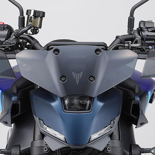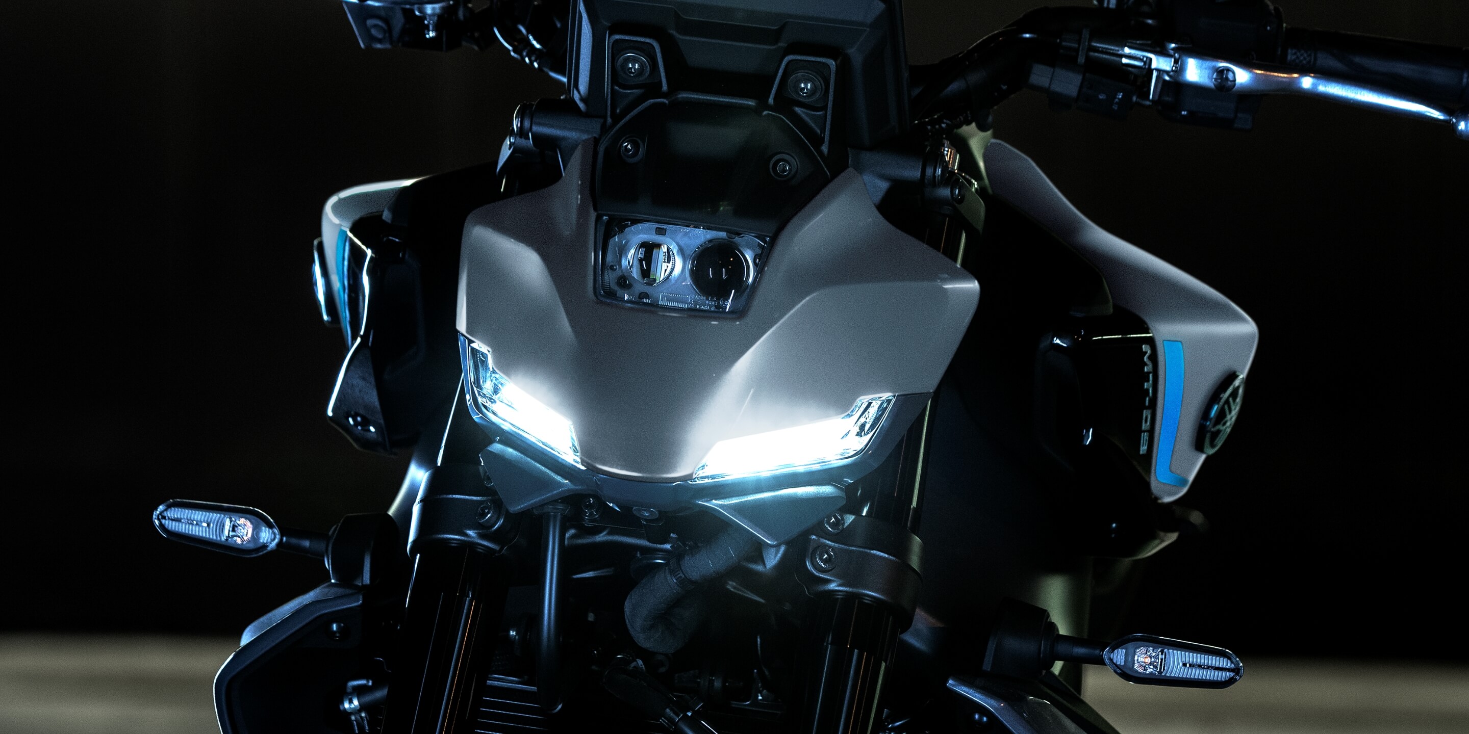 ヘッドランプをはじめとする機能部品をひとつの塊=フェイスと捉える思想。バイファンクショナルLEDライトは、小型で薄い小径レンズモジュールを採用しイメージを一新。ヘッドランプはクールな表情と機能美を表現している。ヘッドランプカバーはフューエルタンクとの一体感を高める造形に作り込み、これら凝縮された機能部品がMT伝統のマスの集中化とショートオーバーハングのスタイルに更に磨きをかける。