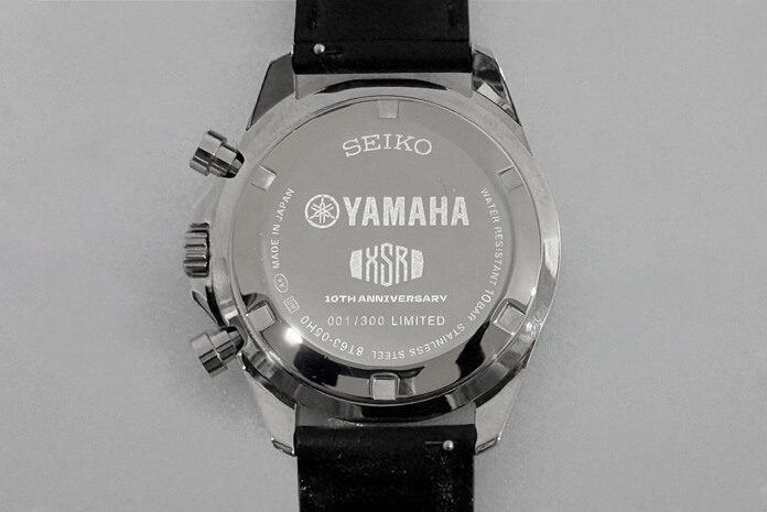 初代XSRタンクのヘアライン仕上げをイメージした文字盤には、XSRロゴとタコメーター風クロノグラフがデザインされています。その他にもフロントフォークキャップを平面的に表現したリューズや、シート表皮をイメージしたXSRロゴ入りバンドをクロとブラウンで2本用意。時針・分針は短い蓄光でも長時間光るルミブライト®で暗い環境でも時間を示します。背面にはヤマハロゴに加え、限定300本の証であるシリアルナンバーを刻印。こだわりを随所に散りばめた逸品です。2026年10月発売予定。