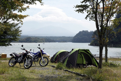 今回お世話になったキャンプ場、「精進湖キャンピングコテージ」はテントの設営場所までバイク乗り入れOK。道路からキャンプスペースまでの未舗装路も、慌てず安全に走れる安心感はオフロードマシンのセロー、WR250Rならではですね。