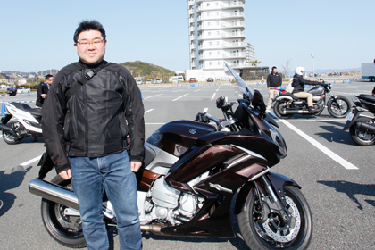 「FJR1300ASを目当てで試乗会に来ました。YCC-Sはオートマのクルマに乗っているように滑らかですね。スピードを落とすと自動的にギアを落とSTOP MODEにも感心しました。まだ少ししか乗っていませんが、低速のUターンではどうなるんだろうかとか、使いこんでいった時の興味が尽きません。またエンジンの振動がしっかり抑えられていて、高回転までスムーズに回っていきそうな印象ですね」
