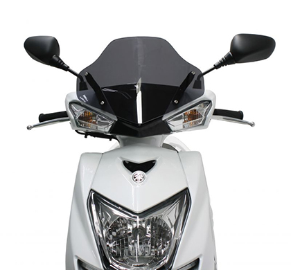 ↑「シグナスX SR」の注目アイテムは、まずウインドシールド。三次元立体曲面成型により見た目のスポーティさと機能性を両立。10度の範囲で走行状況に合わせてスクリーンの角度が調整可能です(写真は高めのウインドシールドHC。13,800円)