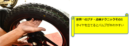 そこで編み出したのが「もみもみ作戦」。タイヤをリムに固定しているビードを外す時、自分の手応えでは、しっかり1発目で外せていても審査員の視覚的に分かりにくく、チューブが噛みこんでいると見られる可能性もあるため、タイヤレバーを前後に動かし“もみもみ”して噛み込んでいないことを客観的にアピールすることを考えたのだそうです