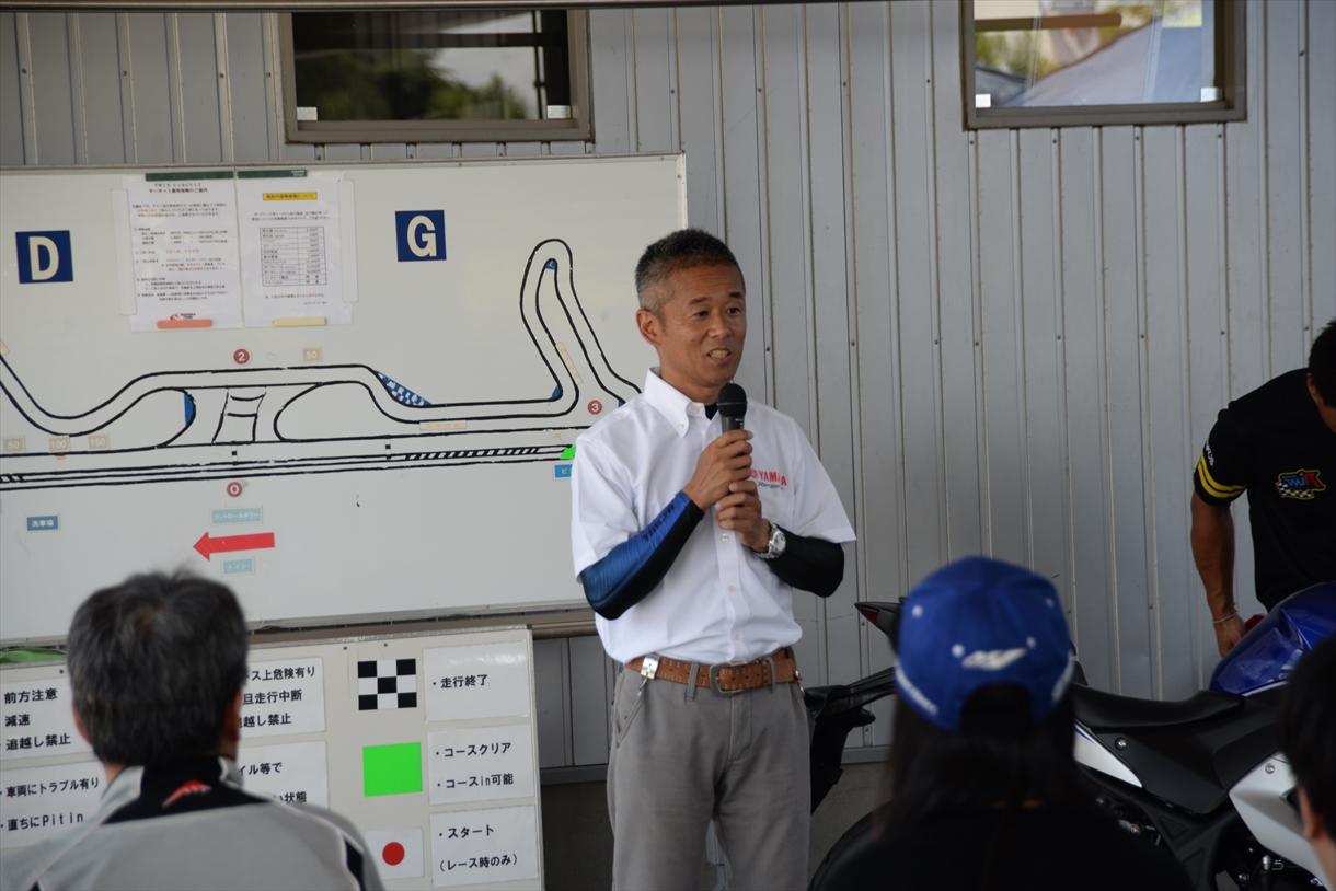 ↑サーキット走行前にライディングポイントをレクチャーするサーキット講習会が開かれました。その講師は、元ヤマハファクトリーライダーである加藤義昌さん。加藤さんは93年にヤマハワークスに加入し、その年にMFJチャンピオン(125cc)を獲得したライダーです。現在も