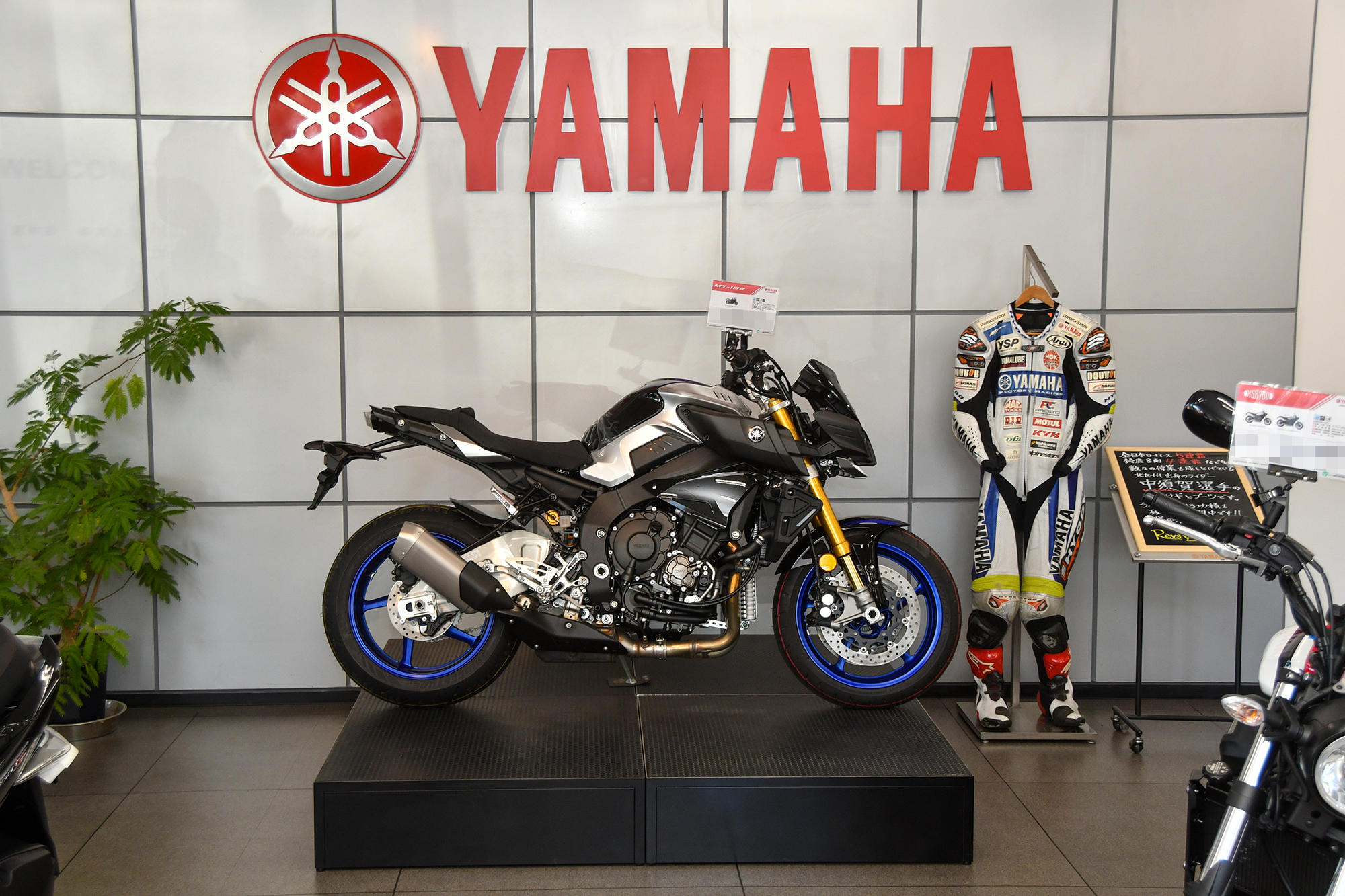 MTシリーズ最高峰「MT-10」が存在感を放つ店舗中央。その横に、なんと!全日本ロードレース選手権で長年にわたって大活躍のヤマハファクトリーライダー・中須賀 克行選手のつなぎが展示されています。