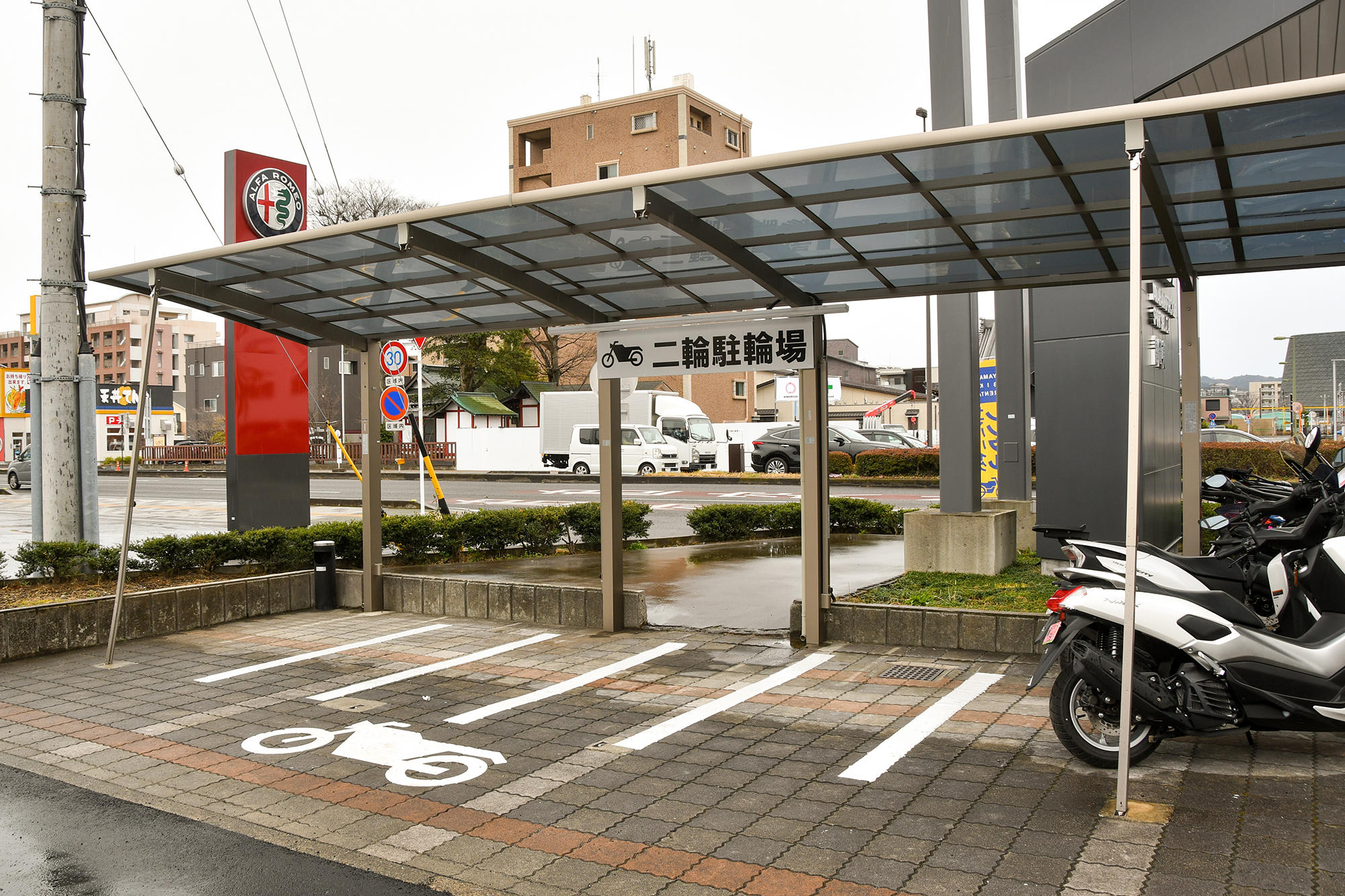 バイク駐輪場は屋根付きなので、雨の日でも安心。ゆっくりレインウエアの脱ぎ着ができますよ。