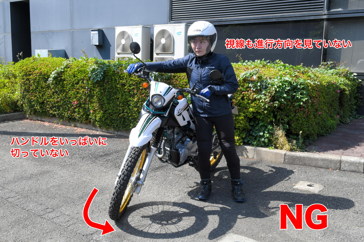 ハンドルをいっぱいに切れない方は「バイクから身体が離れている場合」が多く、ここでも基本姿勢を思い出し、身体とバイクの隙間を空け過ぎないようにしてください。併せて、視線はライディング時と同様に行きたい方向へ向けます。