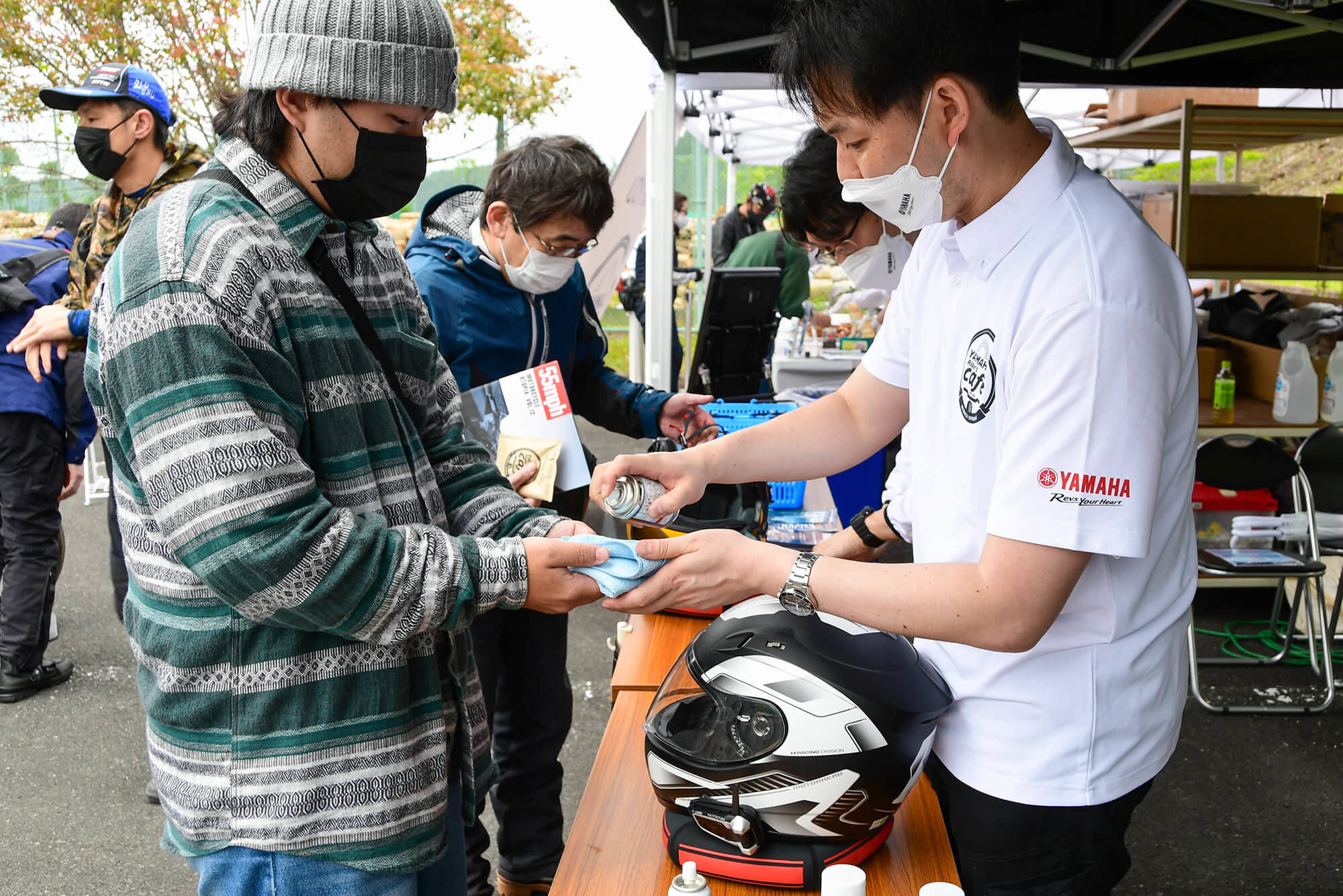 受付の隣ではYAMALUBEケミカルを使ってヘルメットのメンテナンスを体験いただけます。