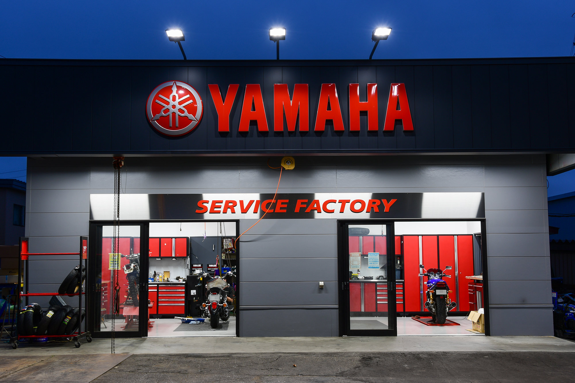 作業用リフトに収納ラックなど、YSPのブランドカラーを構成する赤と黒で統一されています。