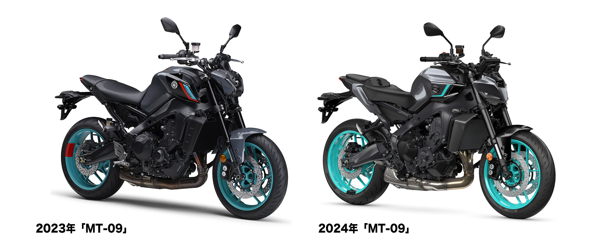 例えば、3色展開の2024年モデル「MT-09」のカラーラインアップを当てはめると、Aに"ブルー"、Cが"マットダークグレー"で、Bには明るいシアンホイールが印象的な"ダークグレー"が当てはまります。