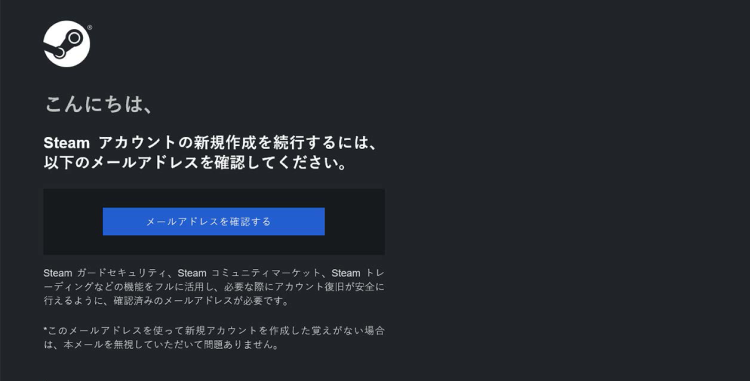2. Steamからメールアドレスにメールが届くので「メールアドレスを確認する」を押します。