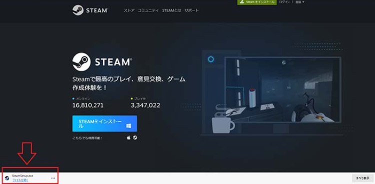 1. Steamのトップページで「Steamをインストール」を押すとインストーラーのダウンロードが始まります。