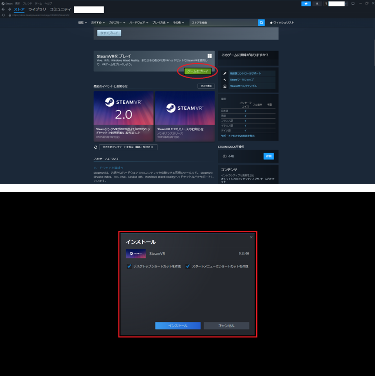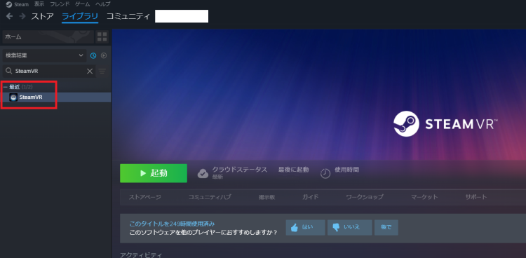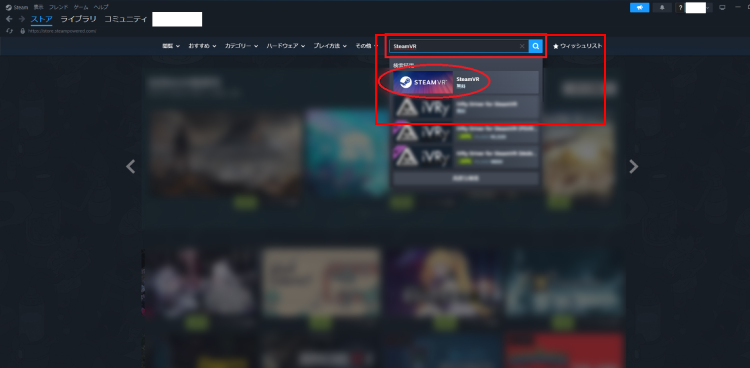 1. Steam内のストア検索から【SteamVR】を検索し、インストールページを開きます。 -
