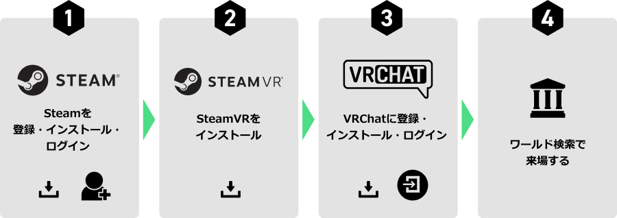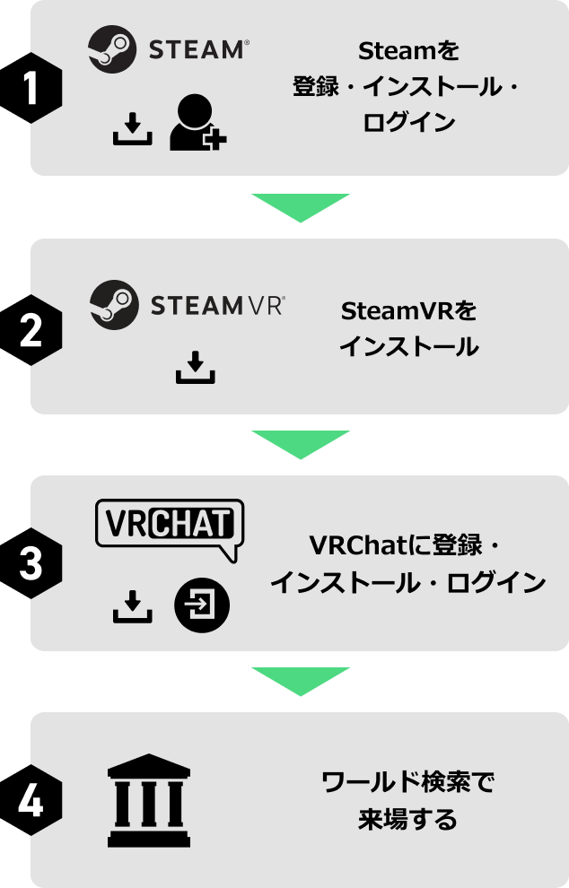 注意:STEAM、VRChat、VR機器の仕様変更に伴い登録手順等が変わる場合もございますが、