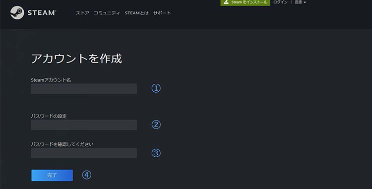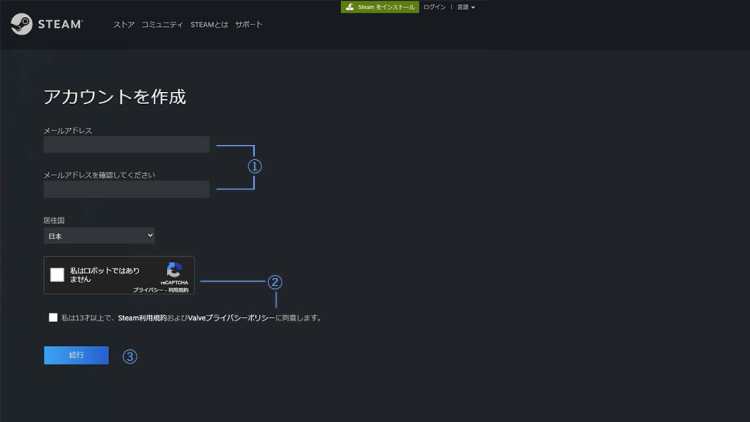 1. 以下のリンクから、Steamのアカウント登録ページに移動します。