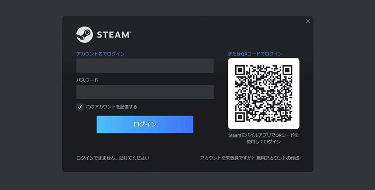 Steamが起動したら、先ほど作成した Steamのアカウントとパスワードを入力し、ログインします。