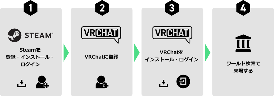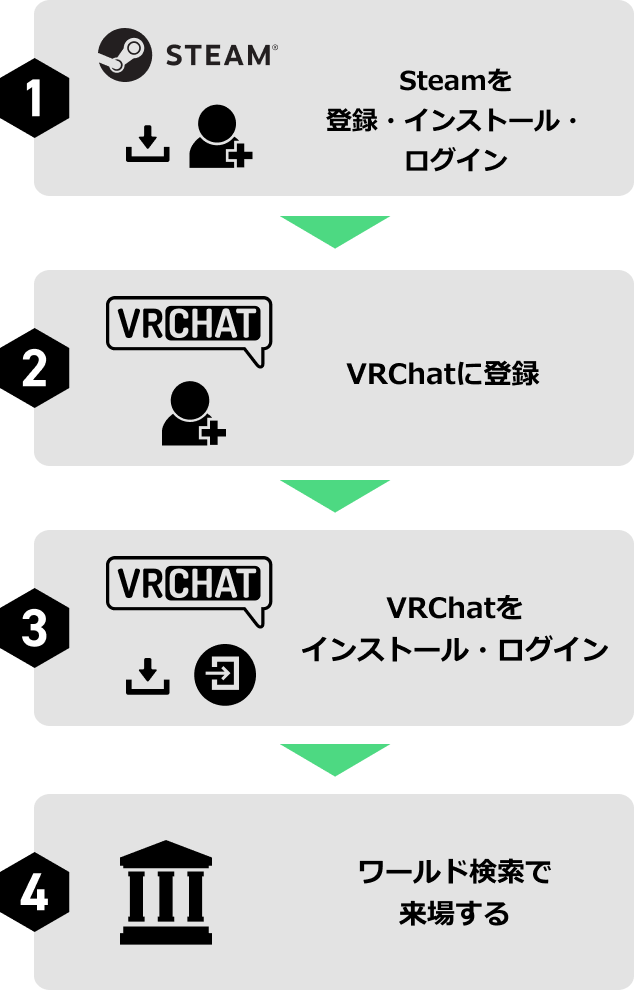注意:STEAM、VRChat、VR機器の仕様変更に伴い登録手順等が変わる場合もございますが、