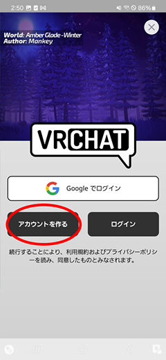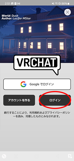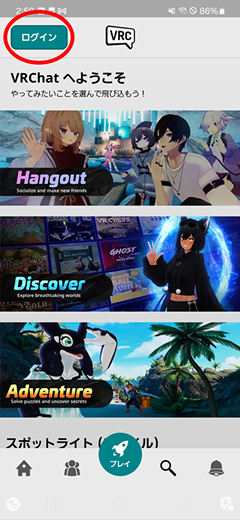 1. 「VRChat」アプリを起動し、左上の「ログイン」を押します -
