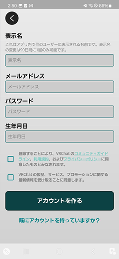 3. 「表示名」「メールアドレス」「パスワード」「生年月日」を入力後、利用規約に同意して「アカウントを作る」を押します。