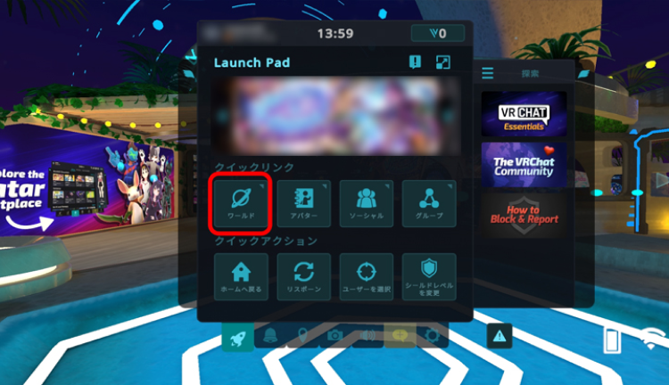 ※ひとりだけで楽しみたい、フレンドとだけ遊びたい等の場合は自分でインスタンス(アクセス制限のあるワールド)を作る必要があります。アクション項目内の「インスタンスを作る」を押して設定しましょう。