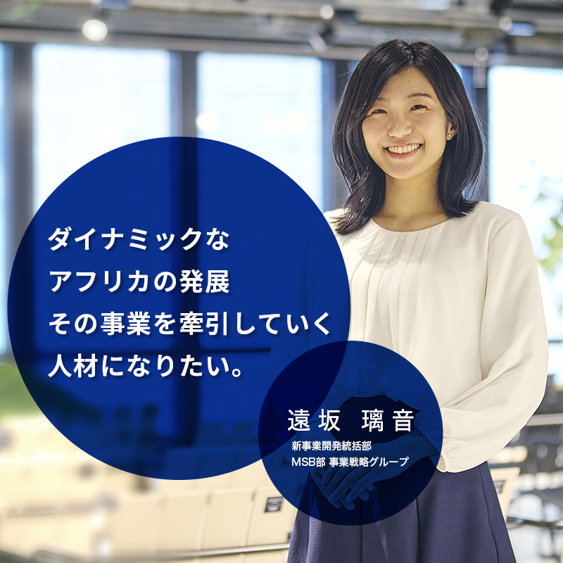 「アフリカで働きたい」――。それは今も持ち続けている希望です。しかし、まだ学ぶべきことが多いということも認識しています。現地に駐在しているリーダーとともに仕事をする中で、彼の背中を見て実感する部分でもあります。 MSB部のスタッフがアフリカに赴任するということは、現地のリーダーとして活躍することを意味します。現地の皆さんをまとめ、牽引していくマネジメントを担うということです。市場環境や働く皆さんを深く理解し、経験と自信をもってリーダーシップを発揮しなくてはなりません。そのためにも、日本での仕事の中できちんとスキルを身につけ、いつかアフリカに渡ってビジネスを動かしていける存在になれるよう、研鑽を積み上げていきたいと思います。